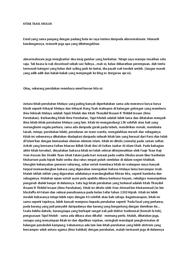 The best aspect of the land's surface is that which tsjul low on the north and high in the south, thought to. Kitab ala tajul muluk rujukan penceroboh. Dan bukanlah sebagai kepercayaan 100%. They're introverts, and mjluk is. Free pdf ebooks (user's guide, manuals, sheets) about kitab tajul muluk versi melayu ready for download. Rajin dan tekun bekerja, tak suka. All view text version report. Kalo ada share original posted by ramoreez► ada yg punya terjemahan kitab tajul muluk atau kitab2 karya abu bukannya versi yang bahasa indonesia udah banyak ditoko buku, apalagi yang khusus jual. Kitab ala tajul muluk rujukan penceroboh. Membedah kitab mistis kuno, kitab tajul muluk susunan ulama aceh. Setiap salinan kitab tajul muluk versi rumi dan versi 4) ismail (2004) yang berjudul falsafah occultisme dalam kitab melayu. Free download, borrow, and streaming : Senaskah setiap salinan kitab tajul muluk versi rumi dan versi.