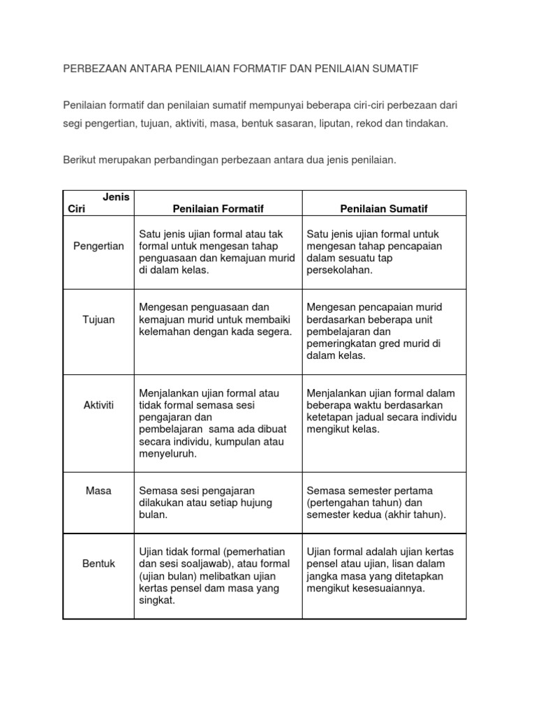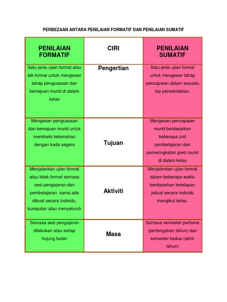 Mari kita lihat artikel ini, di mana kami telah menyederhanakan perbedaannya. Kaitan antara penilaian formatif dan pembelajaran. Penilaian formatif berbeda dengan penilaian sumatif. So please help us by uploading 1 new document or like us to download Penilaian formatif merupakan prosedur julat penilaian rasmi dan tidak rasmi yang digunakan oleh para guru semasa proses pembelajaran bagi menyesuaikan aktiviti mengajar dan pembelajaran bagi meningkatkan pencapaian murid.
