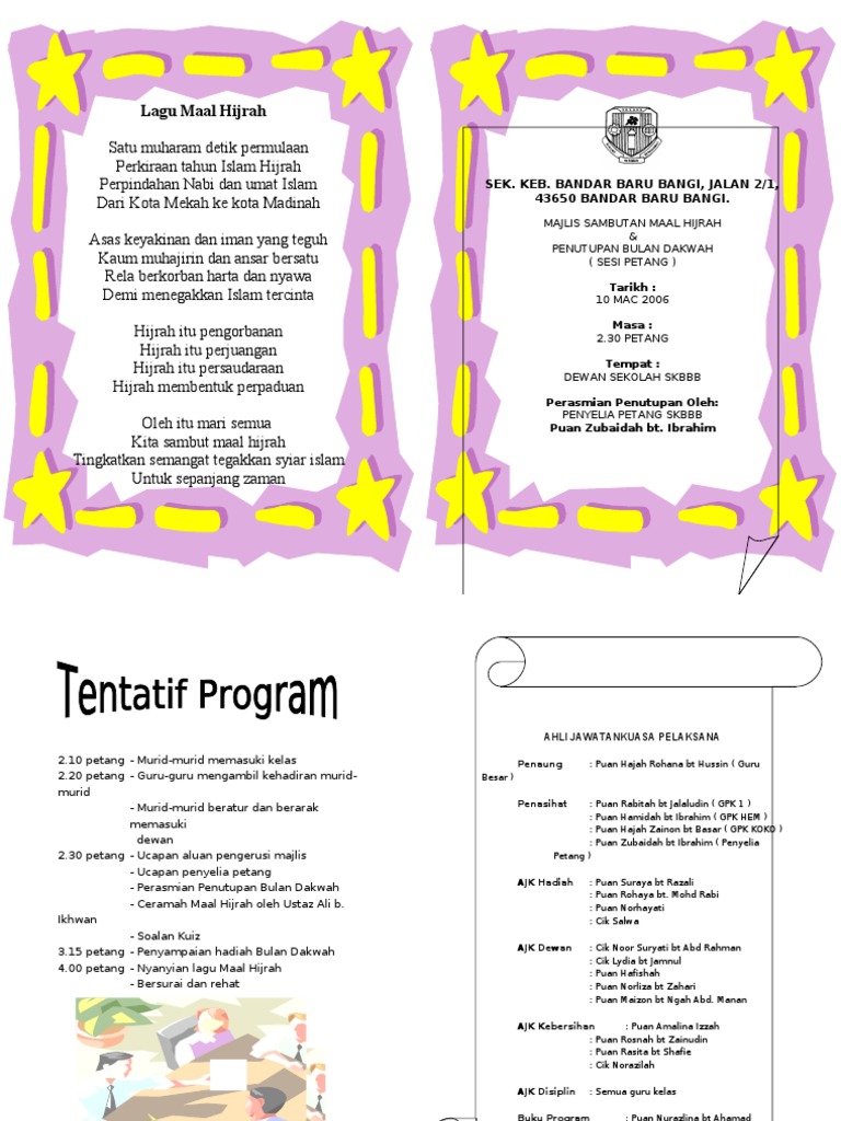 Sempat juga siapkan buku program sambutan bulan kebangsaan dalam norma baharu ini. Surau haji zainuddin , batu 18, jalan kodiang, 06000, jitra, kedah. Kita cuba teruskan sambutan maal hijrah tahun ini tetapi dengan sop ditentukan kkm dan mkn. Aturcara sambutan maal hijrah sksb 2. 13/11/2014 (bersamaan 19muharram 1436)ه hari semua yang terlibat dan menjayakan program ini aturcara majlis: Buku program hari sukan by zamrina rosli 9617 views. Hijrah dari segi istilah merujuk kepada perjalanan yang diambil oleh umat islam dan muhammad pada tahun 622 masihi dari makkah ke madinah. Ketibaan para tetamu jemputan 2.15 petang : Acara tahlilan ini diadakan pada 3 hari, 7 hari, 40 hari, 100 hari pasca meninggalnya orang tersebut. Pergerakan pemuda umno sungai besar bersama dewan pemuda pas kawasan sungai besar menyantuni pengunjung² di pasar jerami. Laporan pelaksanaan internship program sambutan maal hijrah 1437h. Lagu tema maal hijrah (mtv hq audio)muallaf sabah. Setiap kali tahun hijrah tiba, satu perhimpunan akan diadakan di malaysia bagi menyambut tahun hijrah yang baru.
